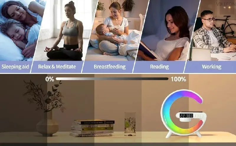Função descrição:Carregamento sem fio rápido 15W, lâmpada da atmosfera, lâmpada da cabeceira, efeito claro deslumbrante, áudio de Bluetooth, viva-voz para chamar; Acorde a luz; Ritmo musical; jogo do orador e Aux, TF, tempo, para a função de sincronização automática Apple Bluetooth; Modo despertador.